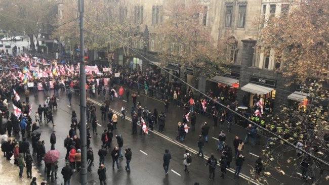 Участники митинга собрались около станции метро «Руставели» в центре города и прошлись колонной до здания Государственной канцелярии — администрации правительства Грузии.