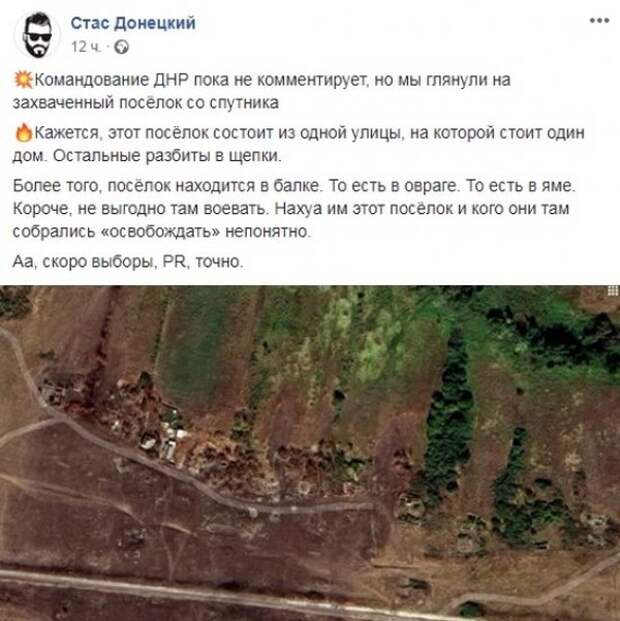«Командование ДНР пока не комментирует, но мы глянули на захваченный поселок со спутника. Кажется, что этот поселок состоит из одной улицы, на которой стоит один дом. Остальные три разбиты в щепки. Более того, поселок находится в балке. То есть в овраге. То есть в яме. Короче, не выгодно там воевать. Зачем им этот поселок и кого они там собрались «освобождать» нам непонятно. А, скоро же выборы PR, точно», – иронизирует Донецкий.